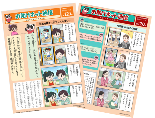 「お助けネット通信」(小学生版・中学生版)は情報モラルを4コマ漫画形式でわかりやすく伝える掲示教材。児童生徒が楽しみながら、自分ごととして捉えることができる。月刊のため情報モラルに関する継続的な指導に役立つ。
