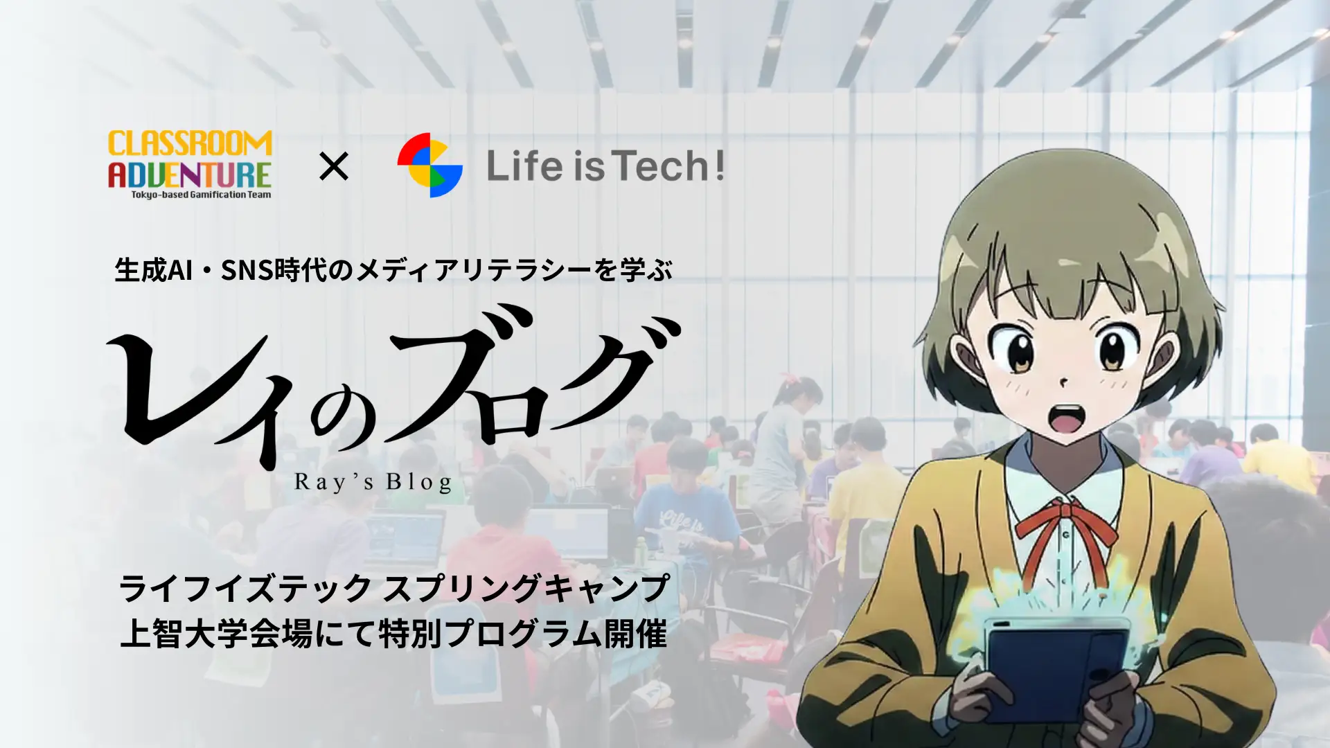 ライフイズテックはClassroom Adventureと連携し、中高生向けAI・プログラミングキャンプ「ライフイズテック スプリングキャンプ」上智大学会場で、生成AI・SNS時代のメディアリテラシーをテーマとした体験型教材「レイのブログ」を活用した特別プログラムを実施する。