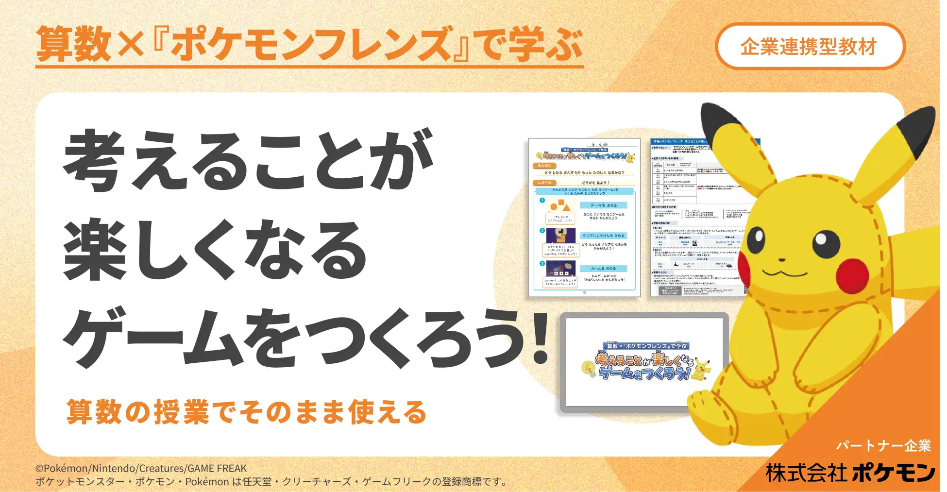 プログラム「算数×『ポケモンフレンズ』で学ぶ 考えることが楽しくなるゲームをつくろう!」は、ポケモンがリリースしているゲーム「ポケモンフレンズ」を題材とした内容となっている。映像教材ではポケモンフレンズを起点に、算数の学習内容をゲームにして考える方法を学び、実際に自分でゲームを考えるプロセスを体験する。取り組み方を工夫することで、考えることが楽しくなることに気づき、日々の学習に楽しく取り組む姿勢を育む。児童生徒は得られた情報を参考にして、実際に算数の「かたちや図形」を題材にしたミニゲームを考える。