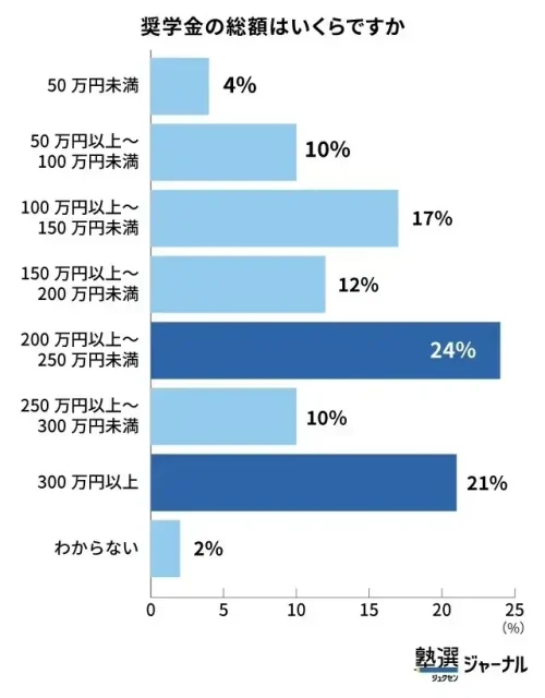 それによると、大学時代に借りた奨学金の総額を聞いたところ、「200万円以上〜250万円未満」24%が最も多く、次に「300万円以上」21%が続いた。「200万円以上」が54%と半数を超えたが、「100万円以上〜150万円未満」17%、「151万円以上〜200万円未満」12%と、「100万円以上」借りていたのは全体の8割を超えた。