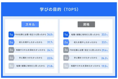 資格取得の目的は、「転職・就職に有利」「収入を増やしたい」が中心だったのに対し、スキル習得では「今の仕事に必要・役立つ」が最多。この違いは、習得後の変化にも表れている。
