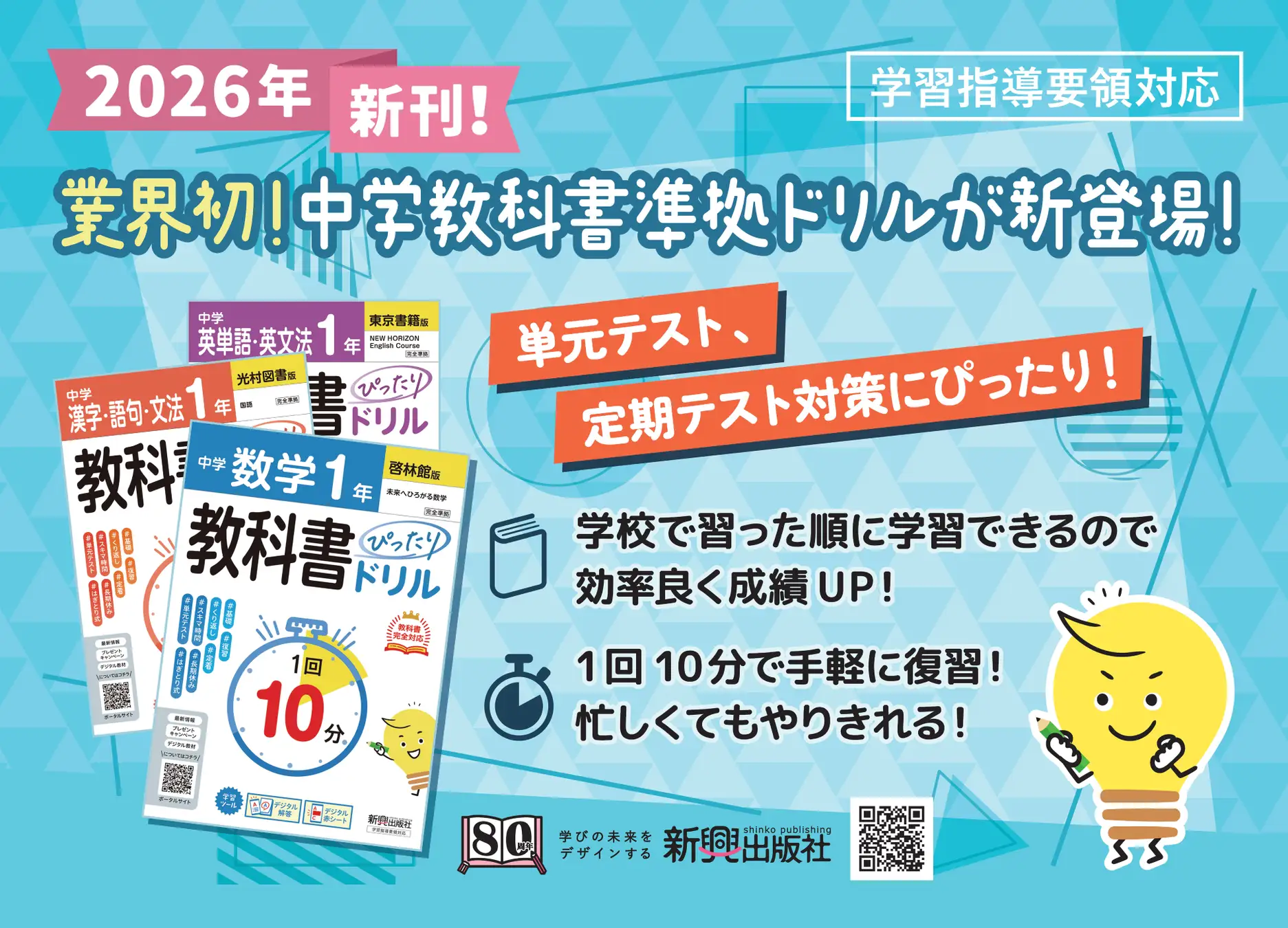 ラインアップは「漢字・語句・文法」「読解・古典」「数学」「計算」「英単語・英文法」「5科」などで、教科書会社別対応版も含む。価格は682円から858円(税込)。短時間での反復学習とデジタル連携を組み合わせ、日常的な学びの定着を支える新しい中学生向け教材として提案している。