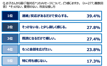 それによると、父親の約6割が、子どもからの「塩対応」を実感。 「もっと会話を広げたい」「寂しい」といったもどかしい想いがある一方で、約7割が「返事や既読があるだけで安心する・嬉しい」とスマホ越しのさりげないやりとりに心の繋がりを感じ、救われていることが明らかになった。