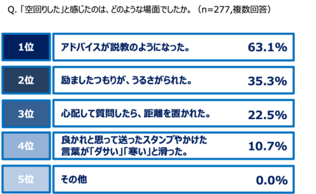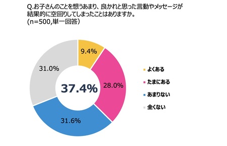 子どもに対し、「力になりたい」という気持ちが空回りしてしまった経験がある父親は約4割(37.4%)にのぼった。中でも「アドバイスが説教のようになってしまった」という回答は2人に1人以上と最多に。良かれと思って伝えた言葉が、思春期の子どもには重く届いてしまうと言った“想いと受け取り方のズレ”に戸惑いながらも、父親たちが試行錯誤を続けている様子が伺える。