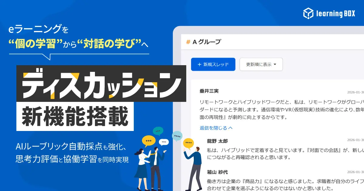 learningBOXは9日、同社のeラーニングシステム「learningBOX」(ラーニングボックス)に、受講者同士が意見交換できる「ディスカッション」機能を新たに搭載するとともに、「AIルーブリック自動採点」機能を3月18日に強化すると発表した。