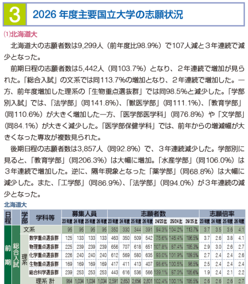 今回の特集では、2026年度の国公立大学入試について、旧七帝大を含む難関国立12大学の志願者数を過去3年と比較し、受験動向を分析している。