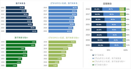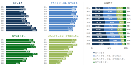 向社会的な行動に関する肯定的な回答の割合は、2010年代後半以降、経年的に上昇しており、向社会的行動が学校文化として定着しつつある可能性が示唆される。重要なのは、これらの変化が一時的なものではなく、複数年にわたる傾向として観察されている点である。