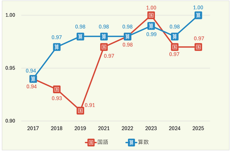 中学校においても同様の傾向が確認され、導入後には全国平均との差が縮小し、近年では全国平均を明確に下回る水準で推移している。