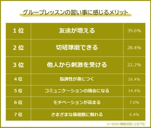 一方、「グループレッスンの習い事に感じるメリット」を聞いたところ、1位は「友達が増える」39.6%で、2位「切磋琢磨できる」28.4%、3位「他人から刺激を受ける」22.2%だった。グループレッスンについては「人と関わること」に価値を感じている保護者が多数おり、新しい友達ができたり、仲間から刺激を受けたりすることが、学びや成長につながると考えられている。
