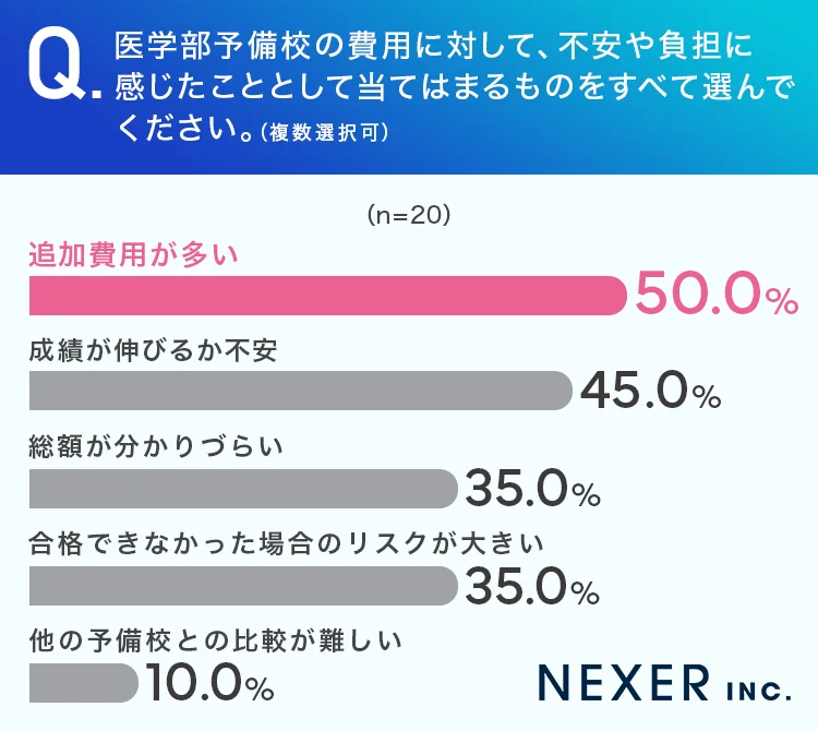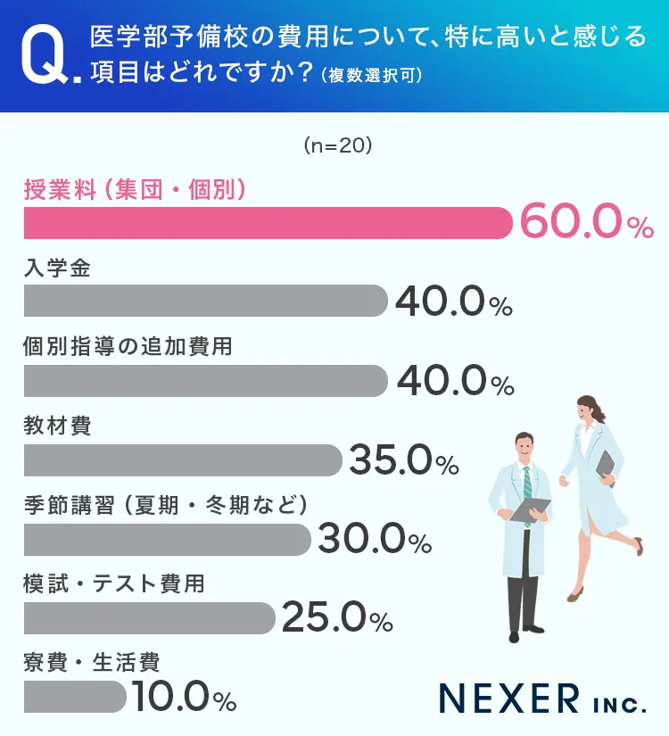 続いて「入学金」と「個別指導の追加費用」がそれぞれ40%、「教材費」が35%となった。医学部専門の指導では高度な知識や経験を持つ講師による授業や個別指導が求められるため、授業料が高額になりやすいとみられる。また、個別指導や追加講座などのオプション費用が総額を押し上げる要因になっている可能性もあるという。