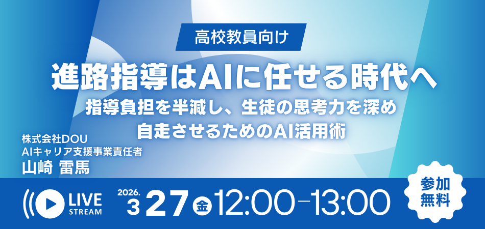 DOUは、高校教員向けウェビナー「進路指導はAIに任せる時代へ ― 指導負担を半減し、生徒の思考力を深め自走させるAI活用術」を、3月27日に開催する。