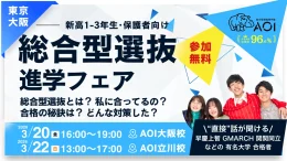 花形が運営する総合型選抜専門塾AOIは、新高校1~3年生と保護者向けに、総合型選抜で大学に合格した学生と直接話せる進学イベント「総合型選抜進学フェア」を、同塾の大阪校と東京・立川校(今月開校の新校舎)で3月20日と22日に無料開催する。