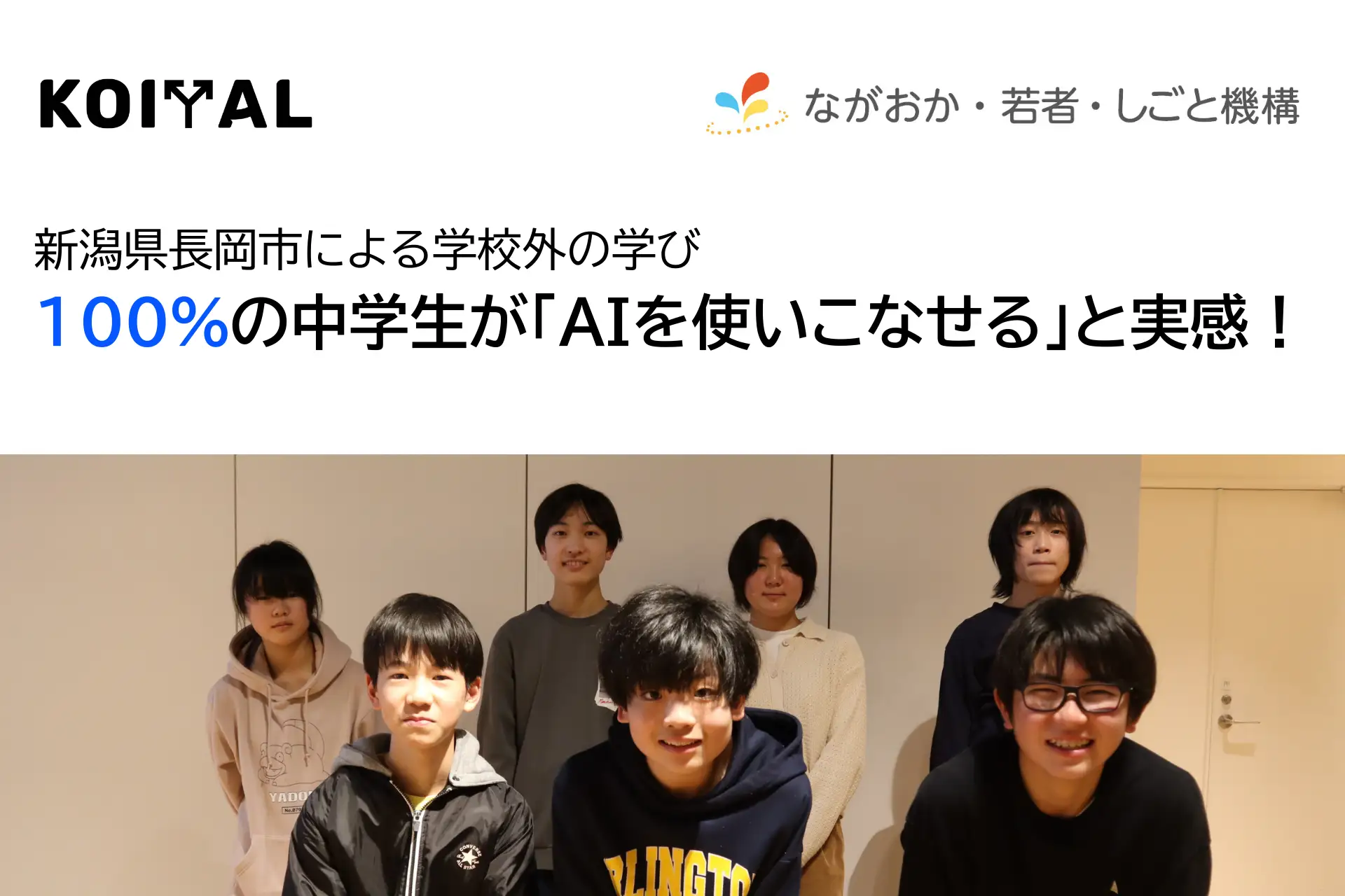 KOIYALは16日、新潟県長岡市における学校外の学びとして、中学生向けAI活用型プログラミングクラブ「AIクリエイティ部」を実施し、今月7日に全13回の全行程を終了したと発表した。