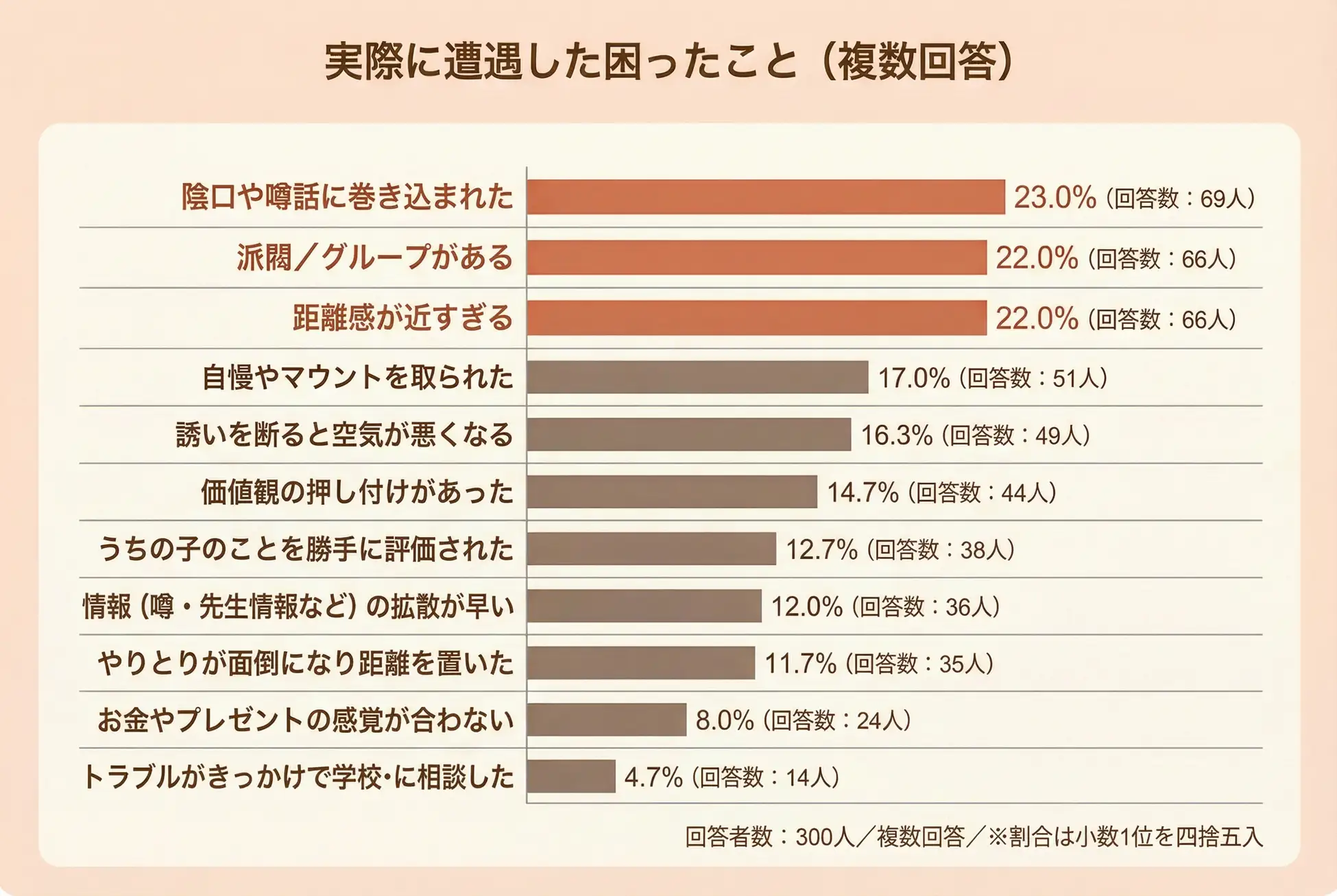 調査は子どものいる10代~60代の男女300名を対象に、1月6日~15日に行われた。それによると、ママ友付き合いでストレスを感じたことのある人は75.0%を占めた。ストレスを感じやすい場面としては、「園・学校行事」32.0%、「PTA・役員・係」29.7%、「グループLINE」27.3%が上位に挙がった。