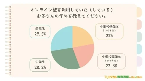 次に、「オンライン塾を利用していた(している)子どもの学年」を聞いたところ、最も多かったのは「中学生」28.2%で、以下、「高校生」27.5%、「小学校高学年(4~6年生)」22.3%、「小学校低学年(1~3年生)」22.0%となり、上級学年の利用がやや多い傾向ではあるが、どの学年にも利用者が分布しているのが分かった。