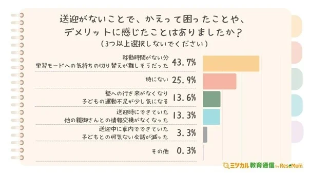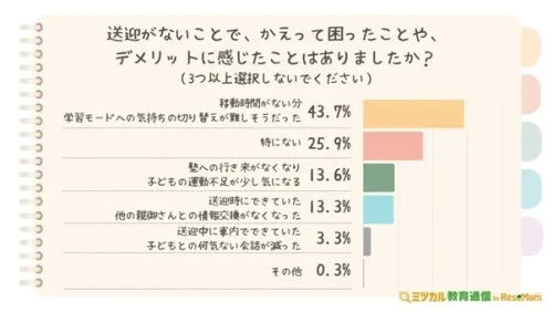 逆に、「送迎がないことで、かえって困ったことや、デメリットに感じたこと」を聞いたところ、最も多かったのは「移動時間がない分、学習モードへの気持ちの切り替えが難しそうだった」43.7%で、全体の4割を超えた。