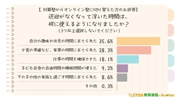 「夕食の準備など、家事の時間にあてられた」28.3%や「下の子や他の家族と過ごす時間にあてられた」8.6%と、家庭のための時間が増加したという声も寄せられた。「子ども自身の自由時間や睡眠時間が増えた」9.2%という、通塾に使っていた時間が子ども本人に還元できているという意見も見られた。