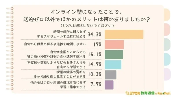 また、「オンライン塾になったことで、送迎ゼロ以外のメリットは何かあったか?」と質問したところ、「時間や場所に縛られず、学習スケジュールを柔軟に組める」34.3%が最も多く、全体の3割を占めた。「自宅や全国どこからでも、質の高い授業や評判の良い講師を選べる」16.1%や「授業の録画や資料を、後から繰り返し見直すことができる」10.3%という、学びのレベルや学習方法の選択肢の広さに着目した回答も多く寄せられた。