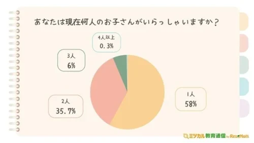 それによると、まず、保護者300人に、「現在の子どもの人数」を聞いたところ、「1人」が58.0%、「2人」が35.7%、「3人」が6.0%、「4人」が0.3%だった。