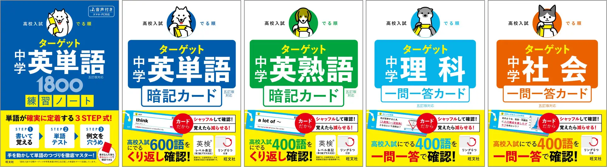 旺文社は23日、2月に刊行した「高校入試 でる順ターゲット 五訂版」シリーズに対応した『中学英単語1800 五訂版対応 練習ノート』および『中学英単語 五訂版対応 暗記カード』『中学英熟語 五訂版対応 暗記カード』『中学理科 五訂版対応 一問一答カード』『中学社会 五訂版対応 一問一答カード』の計5点を刊行した。