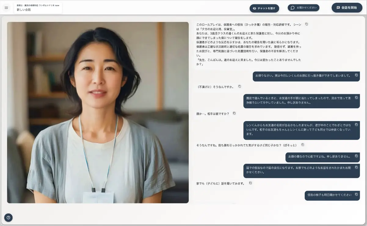 同システムは、PCやタブレット上で、保育士が保護者や子どもと対話するシーンなどの代表的な保育スキルに関わるシチュエーションを再現し、そのAIキャラクターの保護者や子どもとの対話をもとに、保育士の対応の特徴を定量的に測定・分析するもの。