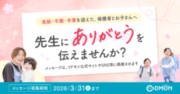 寄せられた感謝の声は編集のうえ、コドモンの公式サイトおよびSNSでまとめて公開し、社会全体で先生方を応援する機会をつくる。募集期間は3月31日まで。