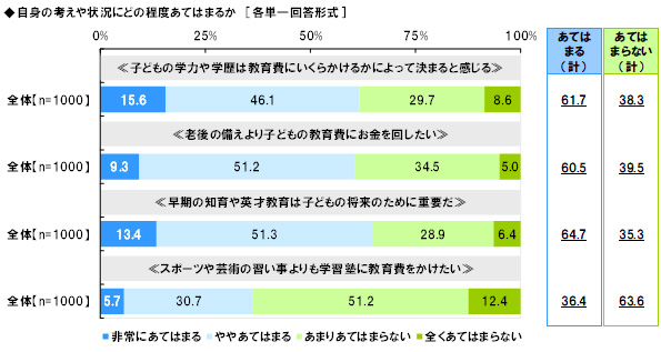 それによると、「教育や教育資金に関する意識」では、「子どもの学力や学歴は教育費にいくらかけるかによって決まる」と親の6割強が実感していることが判明した。親の6割が「老後の備えより子どもの教育費にお金を回したい」と希望。親の6割半が「早期の知育や英才教育は子どもの将来のために重要だ」と回答している。