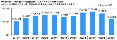 また、学校外教育費の平均支出金額は1万2022円/月で、すべての就学段階で昨年調査から減少し、全体平均では4150円の大幅減少している。