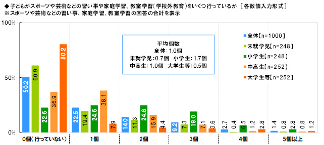3割半が「子どもがスポーツや芸術などの習い事を行っている」(小学生の親では6割強)。2割が「子どもが家庭学習を行っている」(小学生の親では3割半)。3割弱が「子どもが教室学習を行っている」(小学生と中高生の親では4割を上回る)となった。