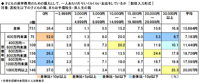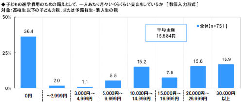 子どもの進学費用のための備えについては、平均支出金額は1万5684円/月、昨年調査から4355円減少した。
