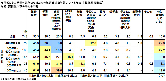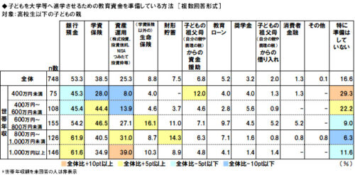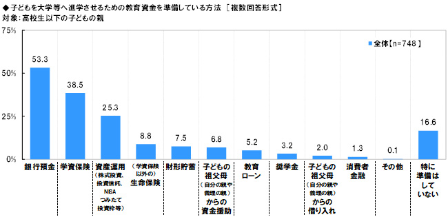 子どもを大学等へ進学させるための教育資金の準備方法は、「銀行預金」が半数以上。大学生等の親が実際に行った方法では「奨学金」、「子どもの祖父母からの資金援助」が高い傾向にある。