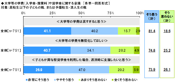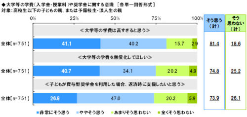 「大学等の学費に関する意識」では、高校生以下・予備校生等の親の8割強が「大学等の学費は高すぎる」と回答。高校生以下・予備校生等の親の7割半が「大学等の学費を無償化してほしい」と希望している。