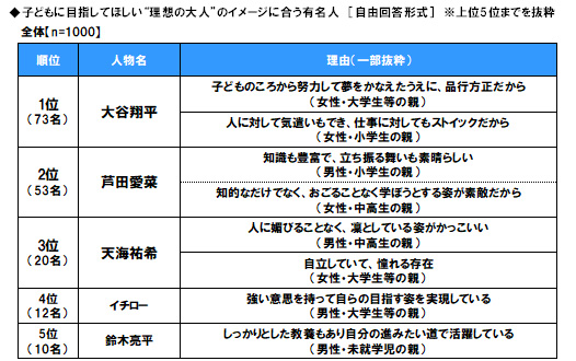 「子どもに目指してほしい理想の大人・就いてほしい職業ランキング2026」では、子どもに目指してほしい“理想の大人”のイメージに合う有名人には、「大谷翔平さん」「芦田愛菜さん」が4年連続TOP2になった。自分の子どもに就いてほしい職業TOP2は男子の親、女子の親ともに「公務員・官僚」「会社員」となった。