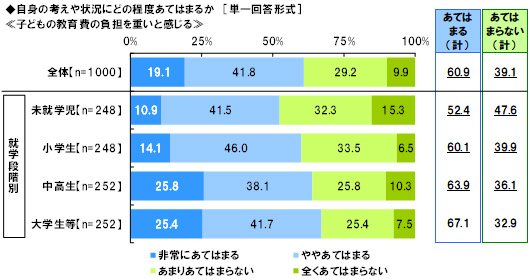 また、親の6割が「子どもの教育費の負担を重いと感じる」と、子どもの就学段階が上がるほど高くなる傾向になった。