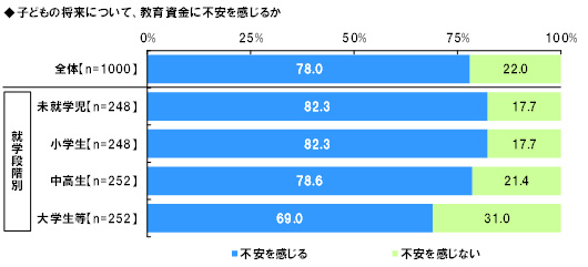 親の8割弱は「子どもの教育資金に不安を感じる」と回答。不安を感じる理由には「物価の上昇」が3年連続1位となった。