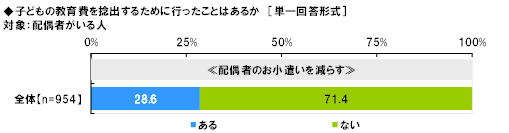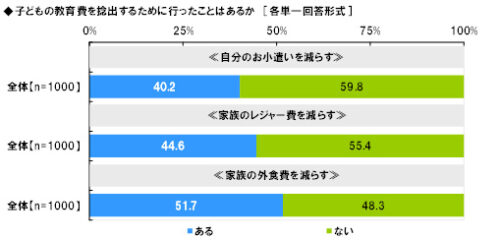 子どもの教育費捻出のための行動については、親の4割が「自分のお小遣いを減らす」。親の4割半が「家族のレジャー費を減らす」。「家族の外食費を減らす」は親の半数以上が経験している。