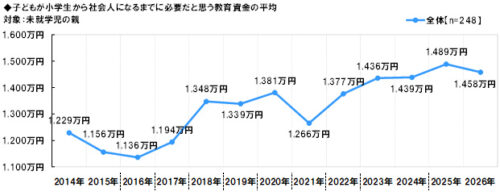 「子育て・教育に関する支出の実態」では、小学生から社会人になるまでに必要な教育資金は、平均予想金額は1458万円だった。昨年調査から31万円の減少となったものの、調査開始以来の最高額に次いで高い水準を維持している。