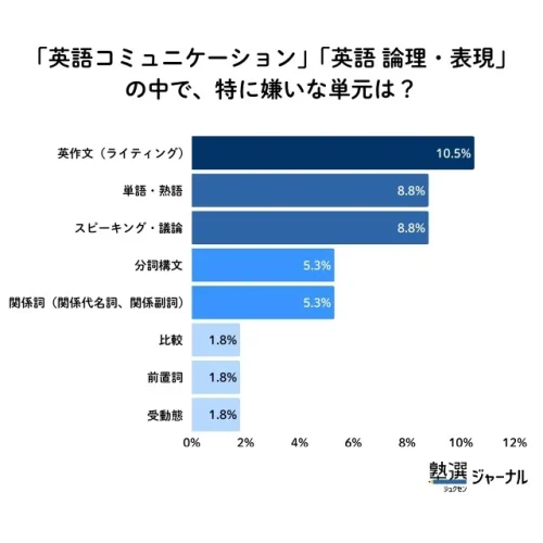 1位の「英語コミュニケーション」と「英語 論理・表現」について、特に嫌いな単元を聞いたところ、文法ではなく「英作文(ライティング)」10.5%がトップで、次いで「単語・熟語」「スピーキング・議論」(各8.8%)という結果になった。高校生からは、単語や文法の暗記が必須であることに加え、授業での発表(音読やスピーキングなど)で周囲と比べて恥ずかしい思いをした経験が寄せられており、それらが苦手意識や「嫌い」に直結しているケースもあるようだ。