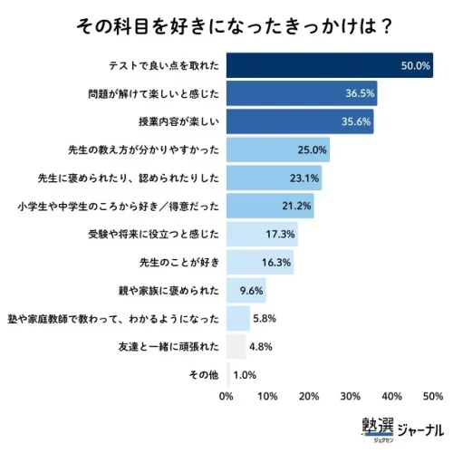 一方、「科目を好きになったきっかけ」について聞いたところ、2人に1人(50.0%)が「テストで良い点を取れた」と回答。続いて「問題が解けて楽しいと感じた」36.5%、「授業内容が楽しい」35.6%が並んだ。嫌いになるきっかけが「失敗体験」であるのに対し、好きになるきっかけは、テストで良い点を取れたことや問題が解けたときの達成感といった「成功体験」が大きく影響しているのが伺える。