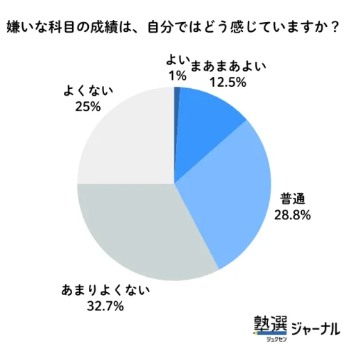 嫌いな科目の「成績」について自己評価を聞いたところ、「あまりよくない」32.7%、「よくない」25.0%という成績が振るわないとする回答が合計57.7%で過半数を占めたものの、嫌いな科目でも成績が「普通以上」と回答している高校生が42.3%にのぼった。「嫌いな科目であっても、なんとか普通以上の成績をキープできている」生徒が4割以上もいるという結果になった。