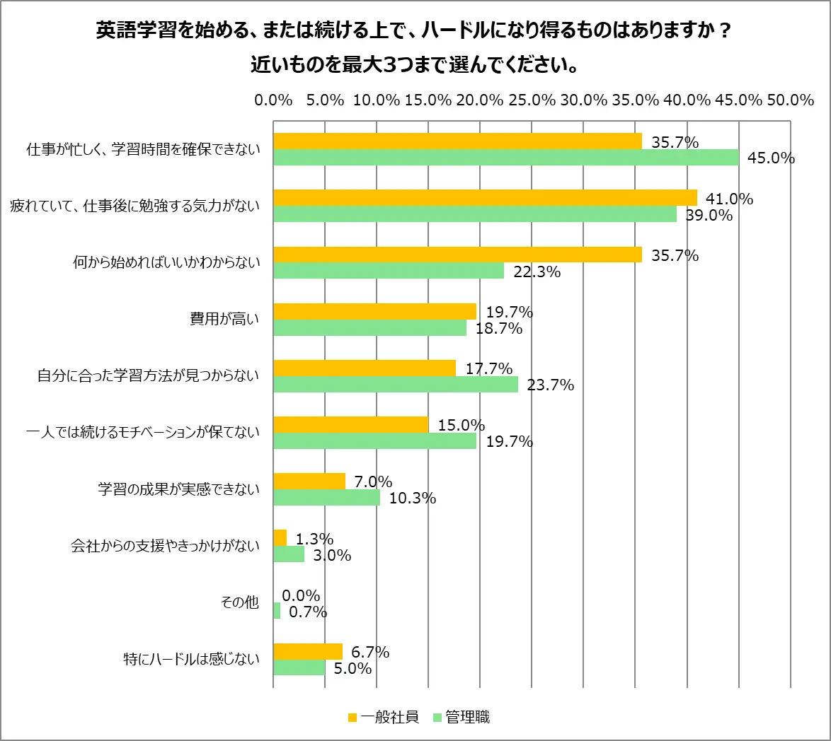学習を始める・続ける上でのハードルは、一般社員では「疲れていて気力がない」、管理職では「仕事が忙しくて時間を確保できない」が1位となった。