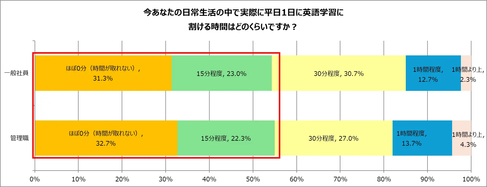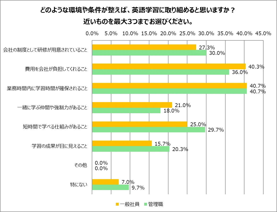 平日1日に英語学習に割ける時間は半数以上が「30分未満」、3割が「ほぼゼロ」となった。学習に取り組める条件は「業務時間内の学習時間確保」が両世代ともに40.7%で最多。上位3項目はいずれも会社の制度的支援に関するものが占めた。