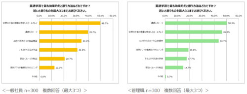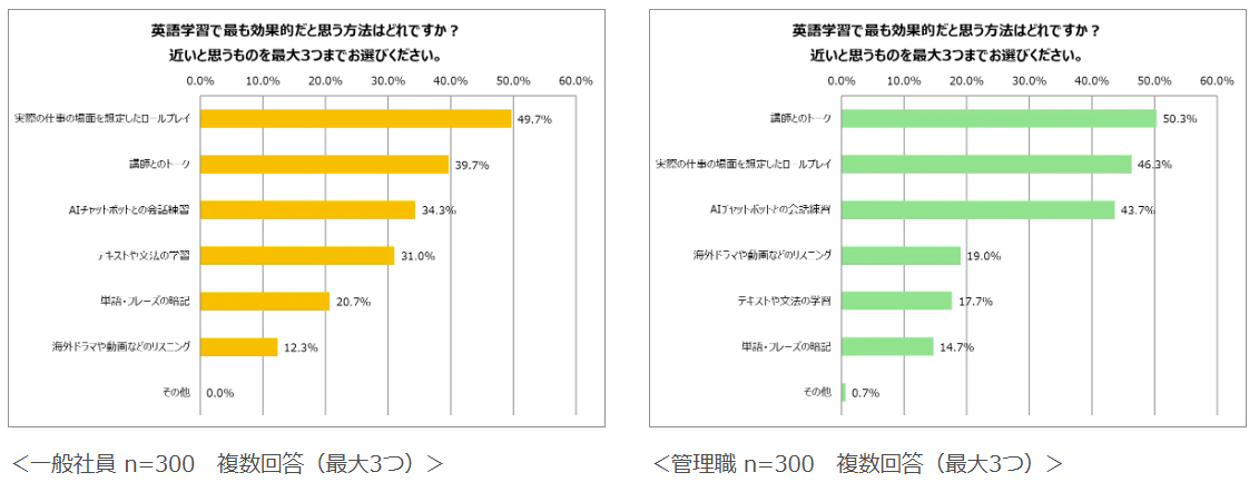 効果的な学習法だと思うものを訊ねたところ、「講師とのトーク」が管理職で50.3%と最多、「ロールプレイ」が一般社員で49.7%と最多となり、ともに実践型の学習法が上位を占めた。