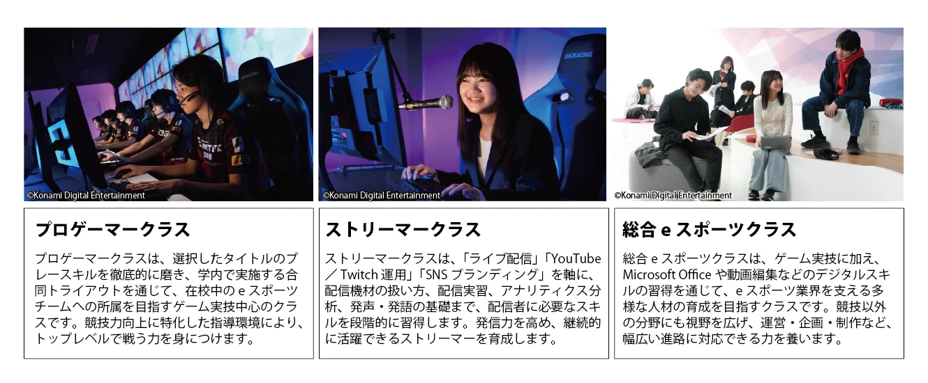 コナミデジタルエンタテインメントは27日、KONAMI eスポーツ学院で、2027年度入校生から「プロゲーマークラス」「総合eスポーツクラス」に加え、新たに「ストリーマークラス」を設けると発表した。