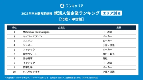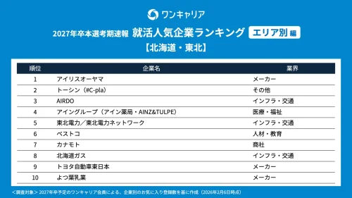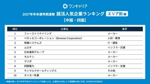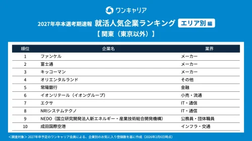 ワンキャリアは26日、「ワンキャリア 就活人気企業ランキング【エリア別編】(27卒本選考期速報)」を発表した。