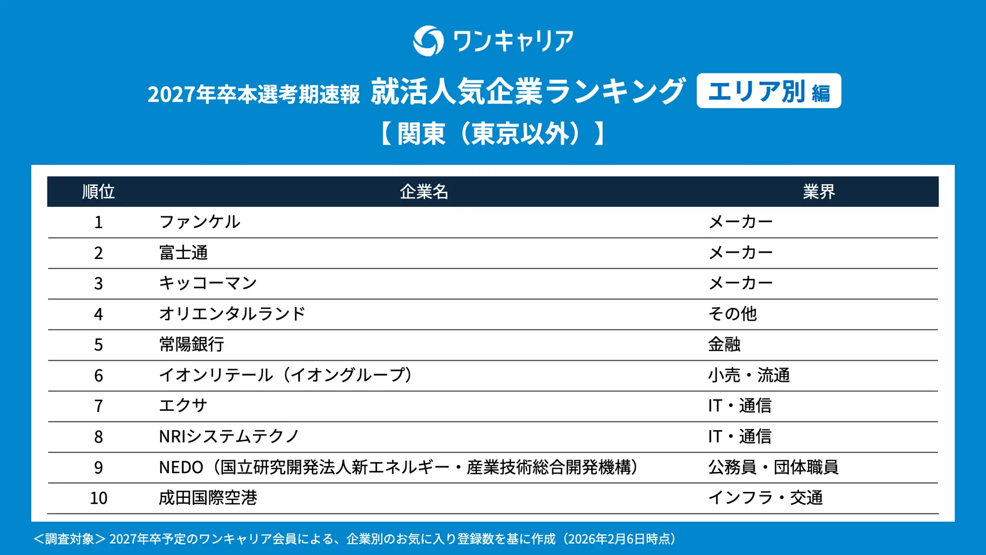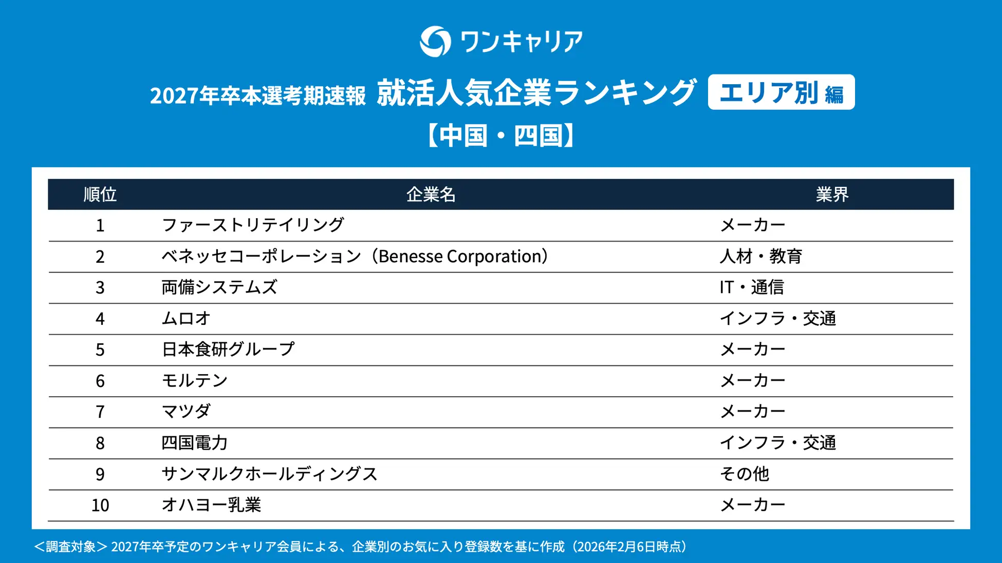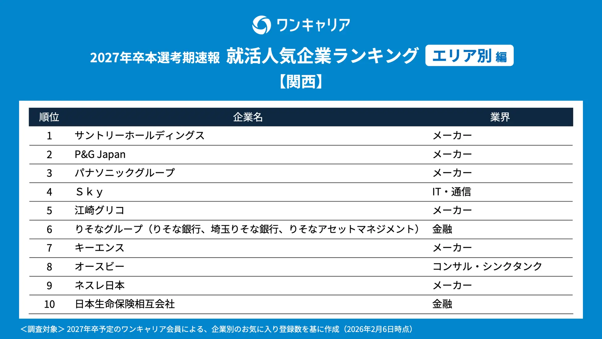 ワンキャリアは26日、「ワンキャリア 就活人気企業ランキング【エリア別編】(27卒本選考期速報)」を発表した。