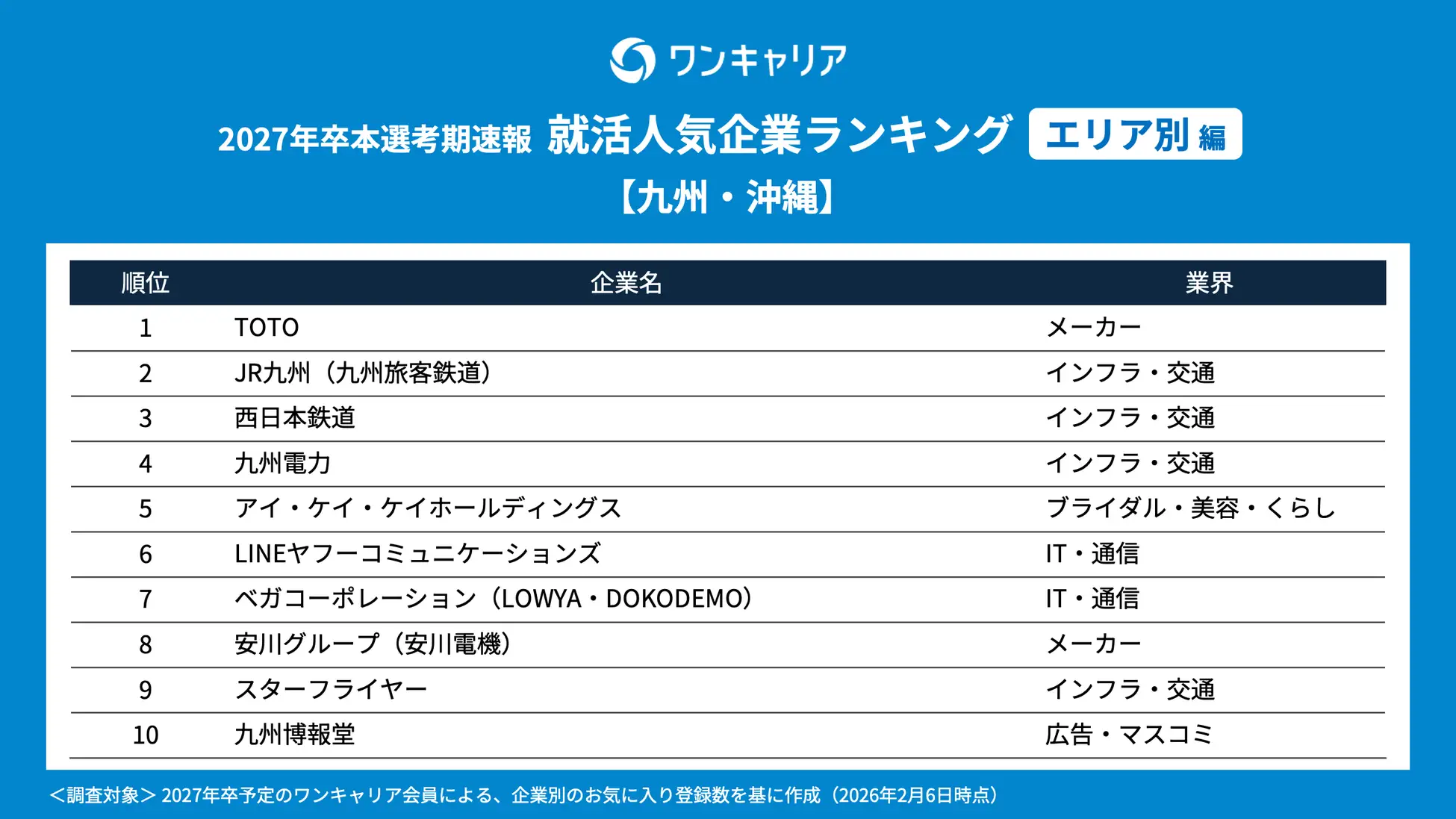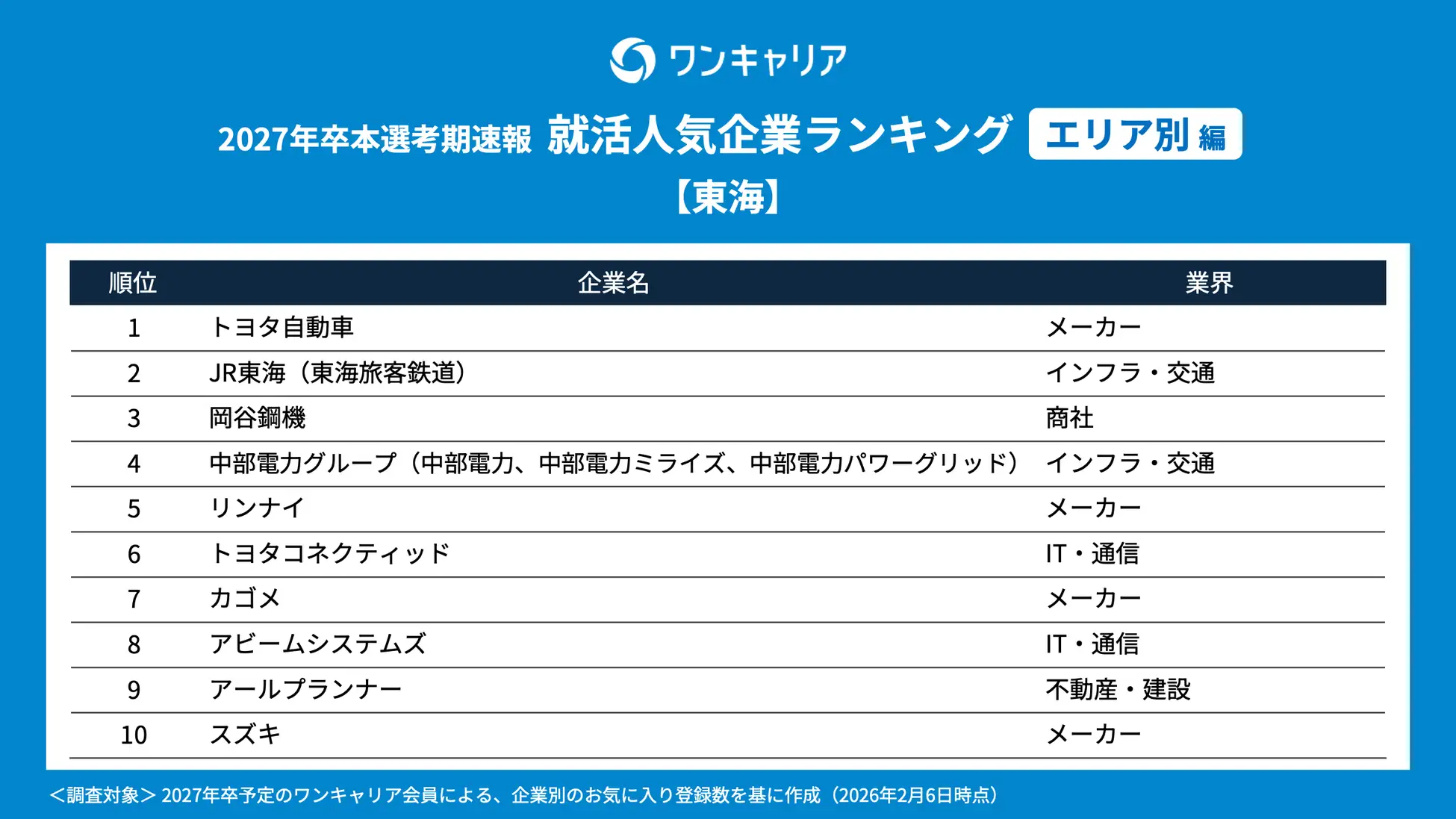 調査対象は、就活支援サービス「ワンキャリア」のユーザーのうち、2027年3月卒業見込みの大学3年生と大学院1年生。調査方法は、企業ページ上の「お気に入り数」を基に集計する方式で、学生が関心を寄せる企業を早い段階で把握できる。ワンキャリアでは、今回のエリア別編に先立ち、「東大・京大編」「文系・理系編」「業界別編」も順次公表していて、多角的な切り口から学生の企業選択の傾向を発信している。