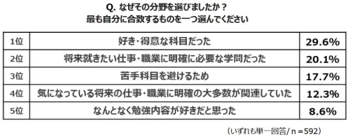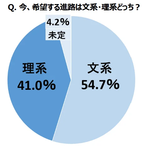 希望する進路は文系・理系どちらかを訊いたところ、文系が54.7%と半数を超えた。その理由を訊ねると、1位は「好き・得意な科目だった」、2位「将来就きたい仕事・職業に明確に必要な学問だった」となり、大きな軸は「得意・苦手」と「将来就きたい仕事」の2つだと分かった。