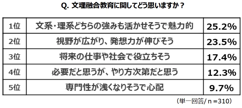 保護者に対し、文系・理系のどちらの要素も併せ持ち横断的に学んでいく「文理融合教育」について訊ねたところ、イメージについては「文系・理系どちら強みも活かせそうで魅力的」「視野が広がり発想力が伸びそう」「将来の仕事や社会で役立ちそう」など、ポジティブな項目が上位に挙がった。また、期待することでは「視野が広がり、進路の選択肢が増える」「社会課題を多角的に考えられるようになる」「文系・理系どちらの強みも活かせる」が上位となった。