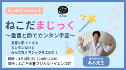 イベントでは、理科が好きな「あお先生」が登場し、重曹と酢を使った”カンタン手品”をライブ形式で紹介する。会場はオンライン上の「ねこだま🎩マジカルサイエンス町」で、その場で一緒に体験できる内容に加え、後日自宅で試せる学びも持ち帰れる構成。質問タイムも設け、子どもたちが理科に親しみながら交流できる機会にする。